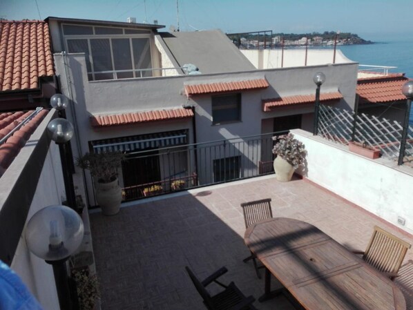 Die zweite Eigenschaft ist eine entzückende Wohnung mit einem unabhängigen Eingang am Meer von Acitrezza, 10 Meter vom Meer entfernt, mit Terrasse, Grill, großer Einbauküche, Gartenmöbeln.
