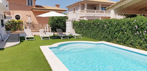 Im Außenbereich erwartet Sie Ihr privater Pool sowie eine eigene Terrasse – ideal, um die mediterrane Sonne zu genießen und sich nach der Erkundung der schönen Umgebung von Alcúdia zu entspannen.