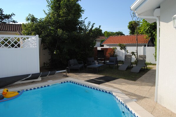 Die Villa bietet 8 bis 10 Betten, verteilt auf 1 Schlafzimmer mit Doppelbett im Erdgeschoss, 1 Schlafzimmer mit Doppelbett im Obergeschoss, 1 Kinderzimmer mit 4 Etagenbetten im Obergeschoss und ein Schlafsofa Fehlersuche im Wohnzimmer. Ihnen stehen 2 Badezimmer und 3 WCs (Erdgeschoss und Obergeschoss) zur Verfügung. Es ist ein idealer Platz für 4 Erwachsene und 4 Kinder.