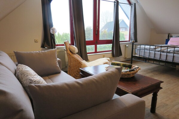 Das Obergeschoss besticht durch seine Gemütlichkeit....das Schlafzimmer bietet drei Schlafmöglichkeiten. Neben dem 1,60m großen Bett gibt es noch ein ausziehbares Sofa. Unser neuer Smart-TV verspricht Regenstunden auszusitzen.