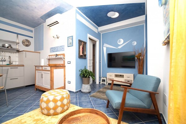 Fotogalerie von Charmante, hochwertig eingerichtete Zweizimmerwohnung im Erdgeschoss der Via Pertossi im historischen Zentrum von Arona.Casa Azzurra ist eine 52 m² große Zweizimmerwohnung mit Klimaanlage, bestehend aus einem Wohn-/Küchenbereich mit Schlafsofa (Doppel