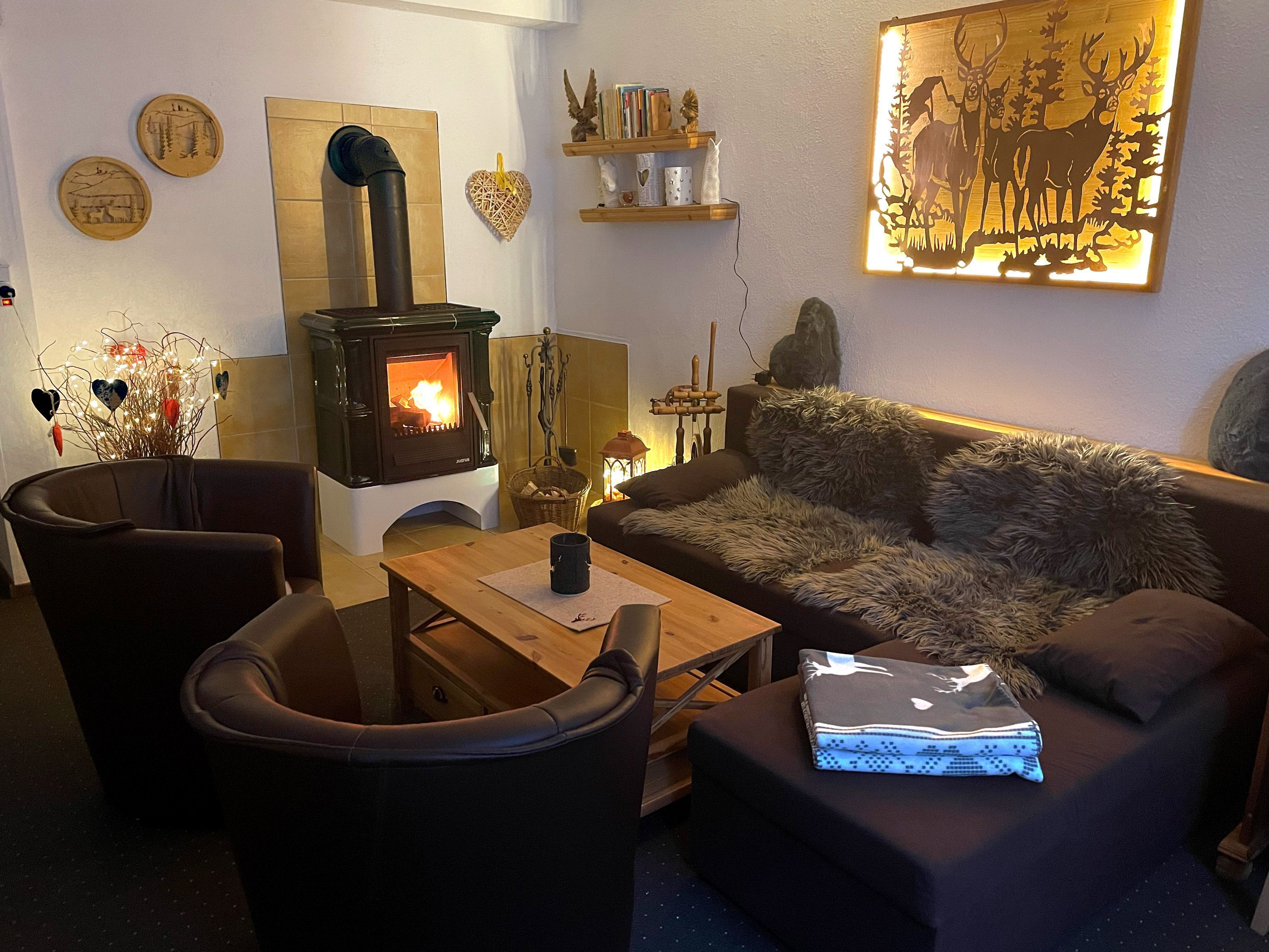 Der großzügige Wohnraum mit großer Couch und Essecke lädt zum Lesen, Fernsehschauen, Musik hören und zum gemütlichen Zusammensein ein. Ein großes, modernes Fernsehgerät sorgt für Unterhaltung und das WLAN bietet Ihnen ein Tor ins Internet.