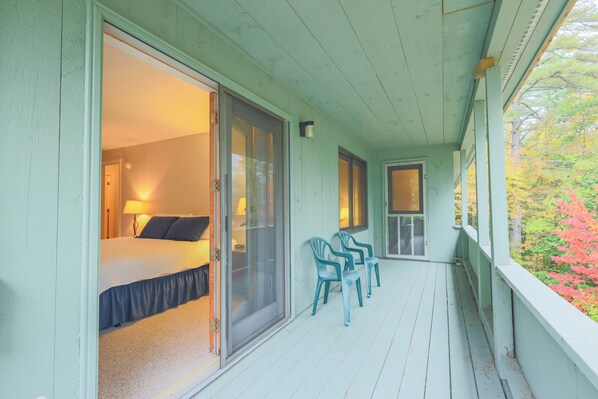 Es gibt zwei privaten Decks in diesem Gerät. Ein im Erdgeschoss sieht in den Wald, ein Obergeschoss mit Blick auf die Eigenschaft.