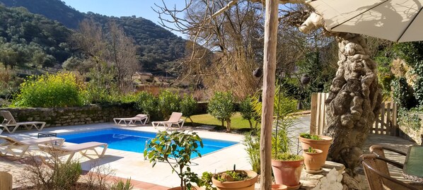 Der Guadiaro River grenzt an den Garten. Von der Steinterrasse aus haben Sie eine gute Aussicht auf alle Teile des Gartens. Es gibt auch einen Bereich mit Gras, der von einer hohen, mit Vegetation bewachsenen Naturmauer umgeben ist. Eine Weinrebe und ein Feigenbaum spenden Schatten auf einer der Terrassen, auf denen Sie Mahlzeiten im Freien genießen können.
