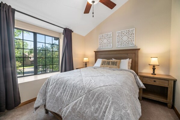 I, my partner, and my friend, his wife and child enjoyed staying at this condo over the 4th of July. There was plenty of space for the 5 of us and it was easy to break up our two groups between the upstairs and downstairs bedrooms. Location was convenient and we enjoyed Big Bear's 4th of July fireworks from the neighborhood's green space/dock. Condo is a quick 5-10 minute drive to the main village and an easy drive to other points of interest. Parking was pretty easy.Two main downsides to this property, in our opinion:1. Check-in process was inconvenient. Despite having a digital lock, I had to drive through the village (twice - to the off-site location and then back to the property) to an off-site location to sign exactly one piece of paper, then was given the lock code. This added another roughly 45 mins to our trip time which, coming from San Diego the day before a holiday, was already more than enough driving for one day. Digitally signing that one piece of paper and avoiding the traffic through the village would be much appreciated, and seems to me like an obvious area for improvement.2. The downstairs (master?) bedroom king bed had two inconveniences to it. First, the bed itself was HUGE. I'm 6'1" and I needed to actually jump up onto the bed, or use the frame itself as a boost step. It's incredibly tall. Second, the mattress had a topper that was incredibly soft, which made sleeping a bit uncomfortable.Those two aside, we enjoyed our stay and would return.