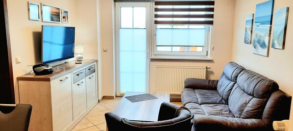 Unsere gemütlich eingerichtete 3-Zimmerwohnung (Nr. 4 oder Nr. 5) befindet sich im 1. Obergeschoss und verfügt über ca. 43 qm. Sie verfügt über einen möblierten Balkon und kann mit bis zu 4 Personen genutzt werden. Die Nichtraucherwohnung teilt sich auf in einen Wohnbereich, zwei Schlafzimmer, Tageslichtbad sowie eine im Wohnzimmer integrierte Küchenzeile mit Essbereich. Das Hauptschlafzimmer erwartet Sie mit Doppelbett sowie Kleiderschrank und TV. Im zweiten Schlafbereich stehen zwei Einzelbetten, Kleiderschrank und TV, zur Verfügung. Das Wohnzimmer ist mit Sofa, Sessel sowie mit einem Flachbild-Smart TV, WLAN und CD-Player mit Radio ausgestattet. Die Küchenzeile verfügt über einen Kühlschrank mit Gefrierfach, Backofen, Geschirrspüler, Geschirr, Besteck, Toaster, Mikrowelle, Ceranfeld, Kaffeemaschine und Wasserkocher. Das Tageslichtbad begrüßt Sie mit Dusche, Haartrockner und WC. Ein PKW- Stellplatz sowie Fahrradabstellmöglichkeit sind am Haus vorhanden.