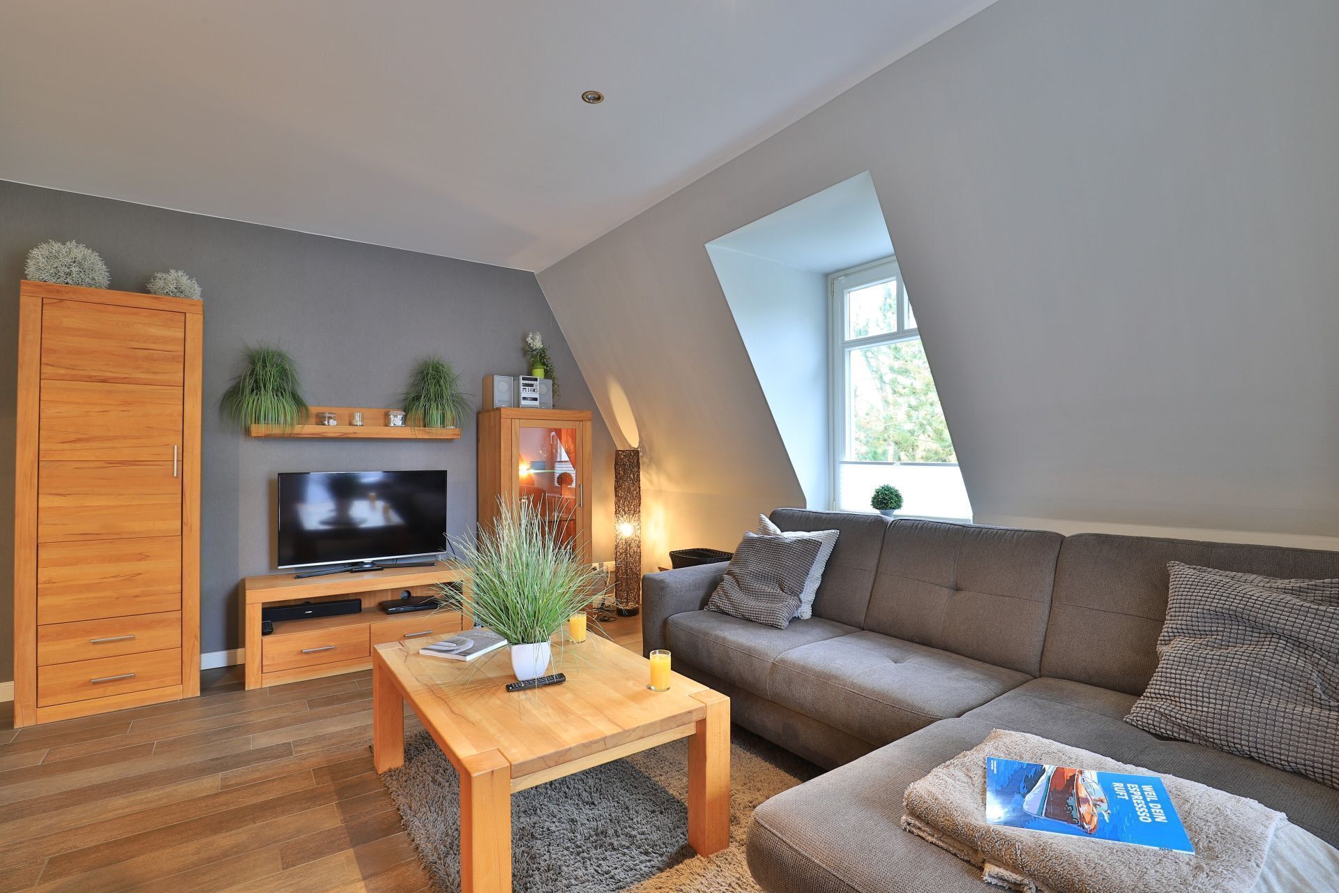 Bodentiefe Fensterelemente bieten dir ein großzügiges Wohngefühl. Vom lichtdurchfluteten Wohnzimmer gelangst du direkt auf den möblierten Balkon. Im Wohnzimmer lädt die gemütliche Sitzecke zum Entspannen ein. Zum Zeitvertreib stehen dir ein Flachbild-TV und eine Stereoanlage zur Verfügung.