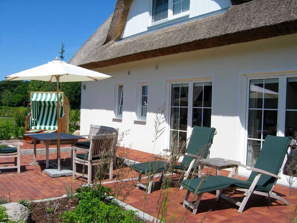 Terrasse und Garten mit Strandkorb