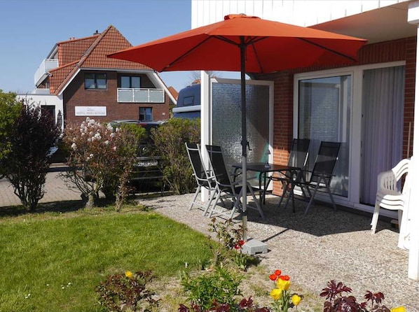 • Vom Wohnzimmer haben Sie direkten Zugang zur möblierten Terrasse und einem schmalen Gartenstreifen. Für gemütliches Verweilen am Abend gibt es eine Außenbeleuchtung.