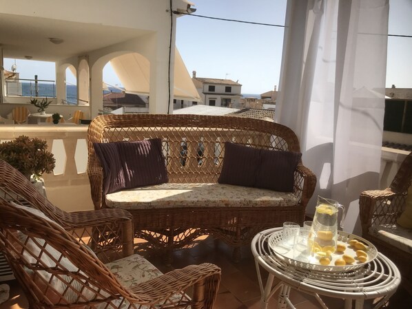 Die Wohnung hat zwei Terrassen, die Rückseite mit Blick auf den Garten, von wo aus die Treppe steigt, und die Vorderseite, die größer ist, zum Meer.