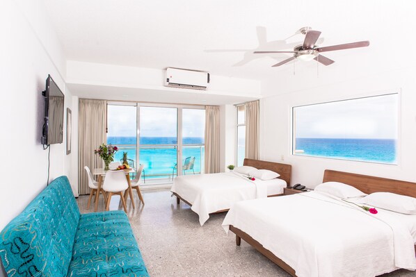 Das erste Schlafzimmer verfügt über zwei Queensize-Betten (und einen Futon) und einen umlaufenden Balkon mit dem nächsten Blick auf den karibischen Strand und das Meer als jedes andere Hotel oder jede andere Wohnung am gesamten Cancun Beach! Enthält eine voll ausgestattete Küche mit allem, was Sie zum Zubereiten von Mahlzeiten benötigen, sowie ein eigenes Bad.