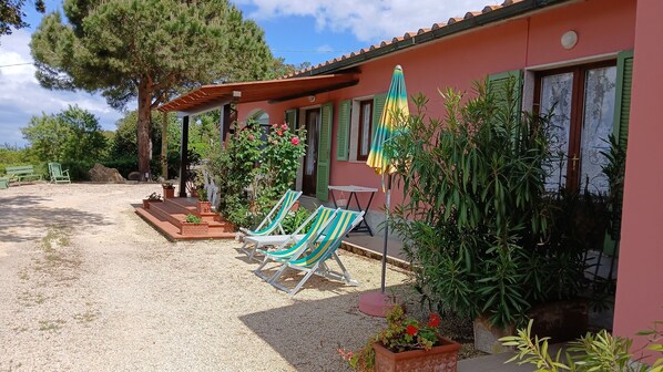 Die Villa teilen; Wäscherei, Grill, Außendusche, Spiele für Kinder und Panoramaplatz mit schönem Garten; Draußen gibt es auch eine überdachte Veranda mit Tischen, Stühlen und Liegestühlen mit Sonnenliegen.
