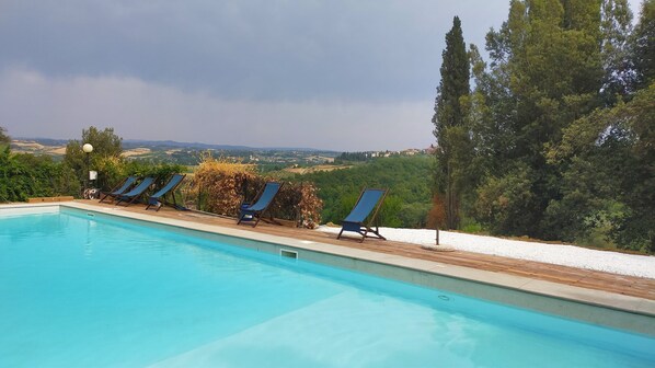 De la terrasse ou de la grande piscine, vous avez une vue à 360 degrés sur la jolie campagne toscane, au milieu d’un parc exceptionnel, ombragé et apaisant (lorsque les autres locataires le respectent le soir).