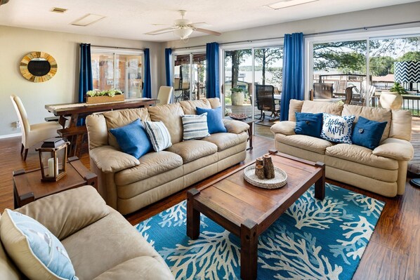 Ein traditionelles Texas Lake House mit einem Hauch von Virgin Islands erwartet Sie nur eine knappe Stunde südöstlich der Innenstadt von Dallas. Das Cruzan Confusion ist passend nach einem traditionellen Getränk der Jungferninseln benannt, das Ihren Geist vorübergehend von Ihren alltäglichen Sorgen "verwirren" soll. Kommen Sie und holen Sie sich einen Barhocker im Barbereich im Freien, den wir "Soggy Dollar North" genannt haben. Entspannen Sie in einer Hängematte, sitzen Sie an der Feuerstelle im Freien oder nehmen Sie auf unserer weitläufigen Außenterrasse, die von einem Baldachin aus schönen Bäumen beschattet wird, Platz an einem unserer zahlreichen Sitzbereiche. Wenn Sie etwas aktiver sein möchten, nehmen Sie ein Paddel auf einem der 2 bereitgestellten Kajaks, schwimmen Sie vom Bootssteg aus oder werfen Sie eine Schlange. Neben Kajaks und Angelruten haben Sie auch Zugang zu einer Auswahl an Hofspielen. Am Bootssteg finden Sie Anlegepeitschen, mit denen Sie Ihr Boot für Ihren Aufenthalt sichern können, eine Rutsche für die Kinder und einen Waverunner-Lift, mit dem Sie bequem die Kajaks starten oder Ihre eigenen Waverunner verstauen können. Der Bootsanleger verfügt auch über einen Bootslift, den Sie gegen eine zusätzliche Gebühr nutzen können. Stellen Sie sicher, dass Sie die fantastische 360-Grad-Aussicht vom großen Partydeck über dem Bootssteg genießen, besonders bei Sonnenuntergang. Wenn Sie das Spiel genießen möchten, während Sie draußen bleiben, können Sie es auf dem 50-Zoll-4K-Smart-Fernseher hinter der Soggy Dollar North-Leiste nach oben ziehen. Oh ja, das Anwesen verfügt auch über ein Haus mit 4 Schlafzimmern, wenn Sie eine Pause von der Natur machen möchten. Die Küche und der Hauptwohnbereich wurden kürzlich renoviert und mit einem hellen nautischen / küstennahen Thema dekoriert, das sich in allen 4 Schlafzimmern widerspiegelt. Das Haus schläft 11 mit einer Königin im Schlafzimmer 1, einer anderen Königin im Schlafzimmer 2, einer Königin und einem Zwilling im Schlafzimmer 3 und einer vollen über vollen Koje im Schlafzimmer 4. Es gibt auch eine einzelne Matratze unter den vollen Etagenbetten, die eine 12. Person schlafen wird. Wenn es Zeit zum Essen ist, werfen Sie etwas zu essen auf den Propangrill an der Außenbar oder bereiten Sie es in der Küche auf den neuen Granitplatten zu. Genießen Sie viele Sitzgelegenheiten zum Essen, einschließlich eines Esstisches auf dem Bauernhof, der Platz für 10-12 Personen bietet. Die Aussicht vom Hausinneren ist nicht zu kurz, da die gesamte Wand zum See hin aus Glasschiebetüren besteht. Entfliehen Sie also dem Alltagsstress und lassen Sie sich bei Cruzan Confusion "verwirren"!
