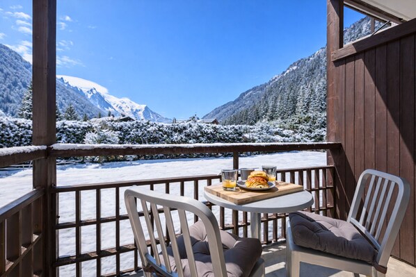 Genießen Sie die Skipisten und die Landschaft des Mont Blanc von diesem exklusiven Balkon mit Pool und Parkplatz vor Ort!
