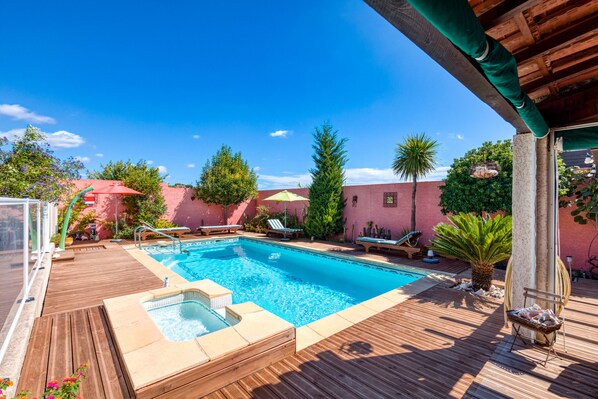 La location dispose d'une terrasse privée, ombragée par une pergola, avec table et chaises de jardin, barbecue, ainsi qu’un jardin méditerranéen privé avec un bassin aux tortues alimenté par une source. La piscine (8x4x1,50 m), enterrée, traditionnelle et traitée au sel, dispose d’un bassin pour bébé, d’un pool house, de transats et de parasols. Elle est accessible à tout moment grâce à un portail sécurisé dont vous possédez les clés. Les plages de la piscine ont récemment été recouvertes de parquet en bois spécial piscine.