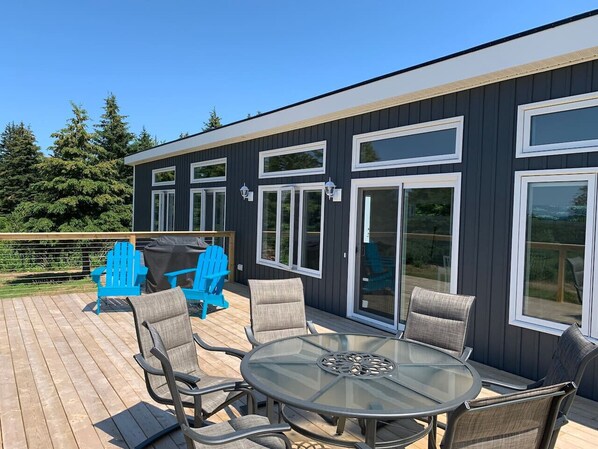 Draußen können Sie vom riesigen hölzernen Sonnendeck aus einen faszinierenden Blick auf das Meer und atemberaubende Sonnenuntergänge in Kap-Breton genießen, während Sie ein Glas Wein oder ein gutes Essen genießen. Das Sonnendeck verfügt über einen bequemen Esstisch und Stühle im Freien sowie einen Propangrill.