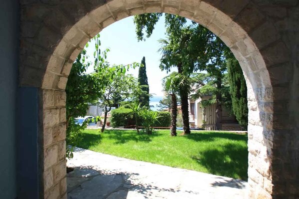 Crikvenica. Die Ferienwohnung befindet sich auf einem Gartengrundstück mit Wiese, Blumen, Sträuchern und Bäumen. Der Vermieter wohnt im Haus. Die Zufahrt erfolgt über eine Nebenstraße (asphaltiert). Parkplatz (für 1 Pkw) in Garage und auf dem Grundstück.