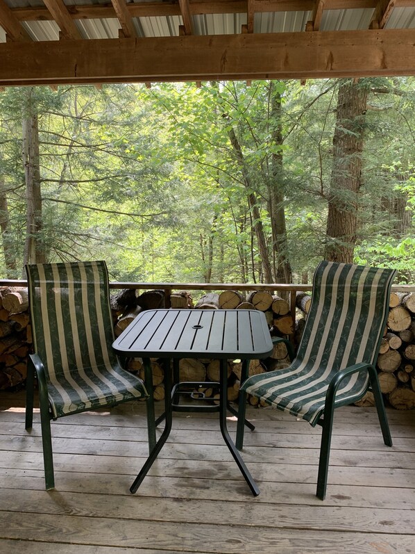 La cabine hors réseau est éclairé par de vieilles lampes à huile façonné pour un éclat doux et romantique, mais elle a aussi commodes lampes solaires 12V. La cheminée de gaz de pétrole liquéfié est parfait pour se détendre dans la soirée, obtenir confortable sur le canapé, ou profiter de la vue depuis le lit double confortable! La beauté de la forêt des flux avec la lumière du soleil à travers la grande banque de fenêtres! café du matin et du soir grogs sont accompagnés par le chant des oiseaux dans les bois, et tout est encore meilleur sur la grande terrasse couverte, qui est également parfait pour les grillades que le soleil se couche! Même lors d'une averse d'été qui passe, le crépitement doux des gouttes de pluie sur le toit de tôle est si paisible! Nous aimons venir ici pour être seul, et nous savons que vous aussi!