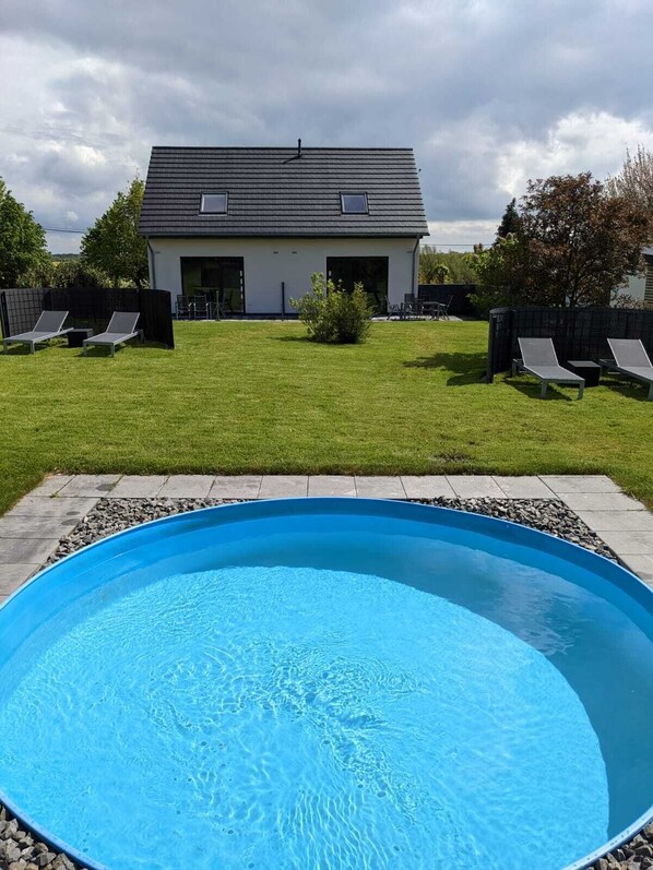 Die großzügige Doppelhaushälfte Satu verfügt im Erdgeschoss neben einem Eingangsbereich über einen hellen bequemen Wohnraum mit 48 Zoll Flachbildfernseher und einer Schlafcouch mit einer Liegefläche in der Größe 140x200 cm. Die offene Küche mit Essbereich ist ausgestattet mit Geschirrspüler, Kühlschrank mit Tiefkühlfach, Kaffeemaschine und Wasserkocher, Backofen und Cerankochfeld. Im HWR verfügt das Haus über eine Waschmaschine. Der Wohnbereich mit Panoramafenster bietet Zugang zur 25 qm großen Terrasse und anschließendem 1.000m² großen Garten mit 10m² großen Kinderpool und 4m Durchmesser großen Trampolin. Das moderne Bad ist mit einer bodentiefen Dusche ausgestattet.