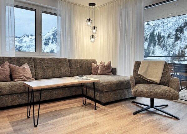 Die offenen, hellen Räume, veredelt mit Täfelungen aus Altholz laden ein zum gemütlichen Verweilen nach erlebnisreichen Urlaubstagen. Ob sportbegeistert oder ruhesuchend, ob kulinarisch oder kulturell interessiert, das Angebot in und um Damüls ist vielseitig. Durch die südseitige Ausrichtung der Apartments genießen Sie von morgens bis abends einen spektakulären Blick in die Bergwelt rund um Damüls, bei angenehmem Wetter von der eigenen Terrasse aus.