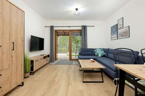 Die Wohnung verfügt über ein Wohnzimmer mit Küchenzeile, 2 Schlafzimmer im Obergeschoss und ein Badezimmer mit Dusche. Eine Terrasse mit Gartenmöbeln lädt zum Entspannen ein. Die Wohnung zeichnet sich durch modernes Design, Ästhetik und Funktionalität aus. Der Wohnbereich mit Schlafcouch und TV ist ein perfekter Ort zum Ausruhen und Entspannen, außerdem ermöglicht eine voll ausgestattete Küchenzeile die Zubereitung Ihrer Lieblingsgerichte. Angenehmes Design und eine umfassende Ausstattung mit den notwendigen Küchen- und Badaccessoires garantieren einen komfortablen Aufenthalt. Die Wohnung verfügt über ein gemütliches Schlafzimmer mit einem bequemen Doppelbett und das andere mit 2 Einzelbetten. Auch Eltern, die mit einem Kind reisen, finden für ihr Kind einen Hochstuhl und ein Reisebett vor.