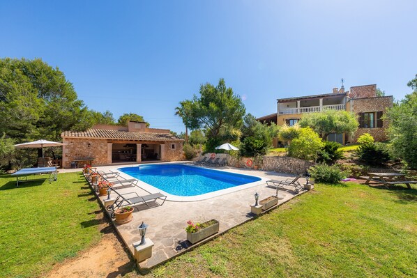 In einen Pinienwald eingebettet, ganz in der Nähe des mallorquinischen Hafenortes Portocolom, liegt die Finca S’Aguait auf einem 16.000 m² großen Grundstück. Die Finca verfügt auf 2 Etagen über einen eleganten Wohn-/Essraum, eine sehr gut ausgestattete, rustikale Landhausküche, 4 Schlafzimmer (3 davon mit jeweils 2 Einzelbetten), einen Fitnessraum, 4 Badezimmer sowie eine zusätzliche Toilette und bietet somit Platz für 8 Personen. Zur Ausstattung gehören außerdem WLAN, eine Klimaanlage in allen Schlafzimmern, ein Kamin, Satellitenfernsehen, Tischtennis, 2 Babybetten und 2 Kinderhochstühle. Es gibt auch einen Billardtisch und 6 Fahrräder, die Ihnen kostenlos zur Verfügung stehen. Der Außenbereich des ländlichen Ferienhauses ist ein absoluter Traum! Hier erwarten Sie mehrere Terrassen, ein Balkon, eine Loggia und ein riesiger Poolbereich, der nachts stimmungsvoll beleuchtet ist. Erfrischen Sie sich im Pool, oder nehmen Sie im angrenzenden, halb offenen Poolhaus leckere, frisch auf dem Grill zubereitete Mahlzeiten an der großen Tafel zu sich. Der Garten, der mit mediterranen Gewächsen bepflanzt wurde und einen Rasen als Liegefläche bietet, schafft zudem eine einzigartige Urlaubsatmosphäre. Nach Portocolom, wo Sie Einkaufsmöglichkeiten, Restaurants, Bars und Cafés finden, gelangen Sie nach 4,5 km bzw. einer 6-minütigen Autofahrt und der weiße Sandstrand der Cala Murada liegt 7,2 km (11 Autominuten) von der Finca entfernt.