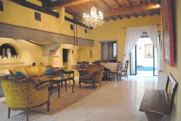 Dieses Haus war früher die 'Forni Reali' oder königliche Bäckerei, die den Medici und später der italienischen Königsfamilie diente, als sie den Palazzo Pitti besetzten. Es umfasst 130 Quadratmeter und verfügt über 3 Schlafzimmer, jedes mit eigenem Bad, ein großes Wohnzimmer und eine voll ausgestattete moderne Küche, ein kleines Arbeitszimmer und ein zusätzliches WC. Die Wohnung bietet Platz für 6-8 Personen und ist von einem schönen Garten im Innenhof umgeben, der mit Blumen, Springbrunnen und Goldfischen geschmückt ist. Das Haus ist komfortabel und charmant eingerichtet und bietet eine vielseitige Mischung aus Antiquitäten und modernen Möbeln.