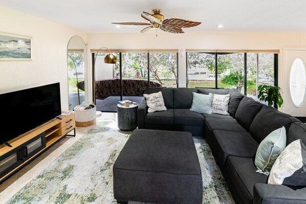 Updated house located on waterway isle. Backyard with private deck at the end of the canal. House has kayak with life vests to use and fishing poles. Beds are comfortable with every type of pillow so you can find the perfect one for you. Air conditioning, new updated kitchen, and new washer and dryer. Front bedroom can be bright at night due to outdoor street light. There are security cameras on the front and back of house. Neighborhood very safe, I walked the neighborhood several times a day and felt completely safe! Highly recommend for your water front peace and quiet. About a 10 min drive to the beach.. Very clean!