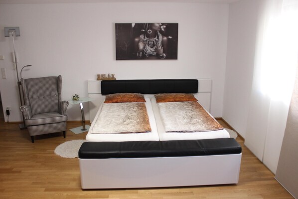 Vorhanden ist ein Wohnraum mit einem Doppelbett und einer Einbauküche, sowie ein Bad mit Dusche. Die Wohnung bietet Platz für max 2 Erwachsene und ein Baby. (Babybett und Hochstuhl gegen Gebühr auf Anfrage erhältlich. )