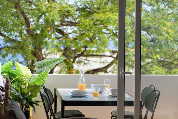 Neben dem Wohnzimmer befindet sich ein Balkon, auf dem Sie zu Abend essen oder das Buch lesen können, das Sie sich für diesen Urlaub ausgesucht haben.
