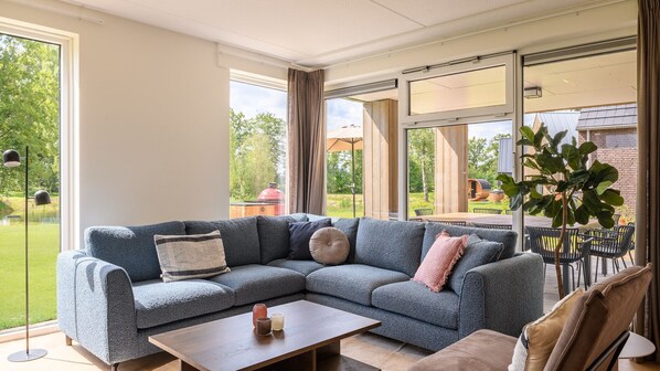 Vom Wohnzimmer aus haben Sie Zugang zum großen Garten mit einer teilweise überdachten Terrasse. Die Terrasse ist mit Gartenmöbeln ausgestattet, auf der Sie mit der ganzen Gesellschaft speisen können. Außerdem gibt es eine mobile Außenküche mit einem luxuriösen Holzkohlegrill und einem Außenkamin mit Pizzaofen. Der Garten liegt direkt am See und bietet freie Aussicht auf die naturreiche Umgebung. Dank der Südlage genießen Sie den ganzen Tag über warme Sonnenstrahlen in Ihrem Garten.