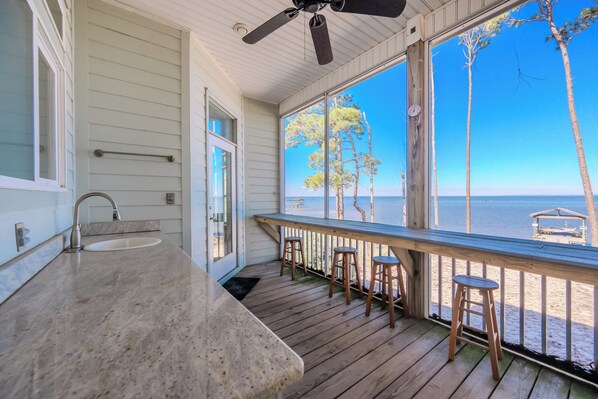 First let me say, The house and the view are amazing. There were some things that I wasn’t very happy about. When we checked in the lady told me she was sorry for the over flowing garbage cans by the road bc the people that checked out that morning trashed the place. Garbage by the street isn’t a big deal but a pile of beer cans by our pier and glass bottle tops everywhere was. The pictures on the walls were hanging sideways and not just a little, I guess they really partied. Knob on closet door fell off and a cabinet door on outside sink area was laying on the countertop. Over all our kids had a great time fishing off the pier and playing in the sand Neighbors were very nice.