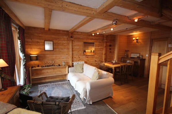 Fläche von ungefähr 72 m² enthält 12 m² unter 1,80 m. 1te Etage. Orientierung : Süd. Niveau 0 : Wohnzimmer mit Kamin, TV. Schlafzimmer mit Doppelbett (160). Schlafzimmer mit 2 Einzelbetten (2*80). Kochnische mit Wasserkocher, Kaffeemaschine, Backofen, Toaster, Waschmaschine, Geschirrspülmaschine, Mikrowellenherd, 4 Induktionsherdplatten, Kühl-Gefrier-Kombination. Badezimmer mit WC. separates WC. Terrasse. Niveau 1 : Mansardenzimmer mit 2 Matratzen (2*80).
