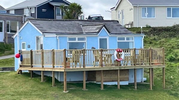 Ein traditionelles 2-Bett-Strandchalet in zentraler Lage an einer flach abfallenden Grasböschung mit Meerblick und nur wenige Gehminuten vom Strand entfernt. Parken Sie direkt vor dem Haus mit Stufen, die zur Haustür führen.