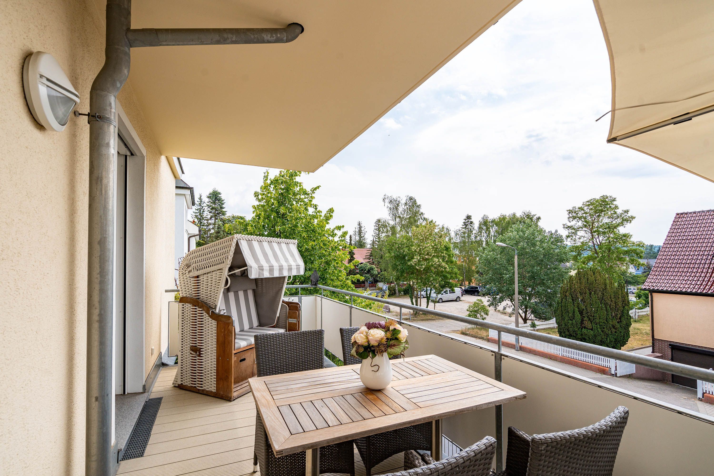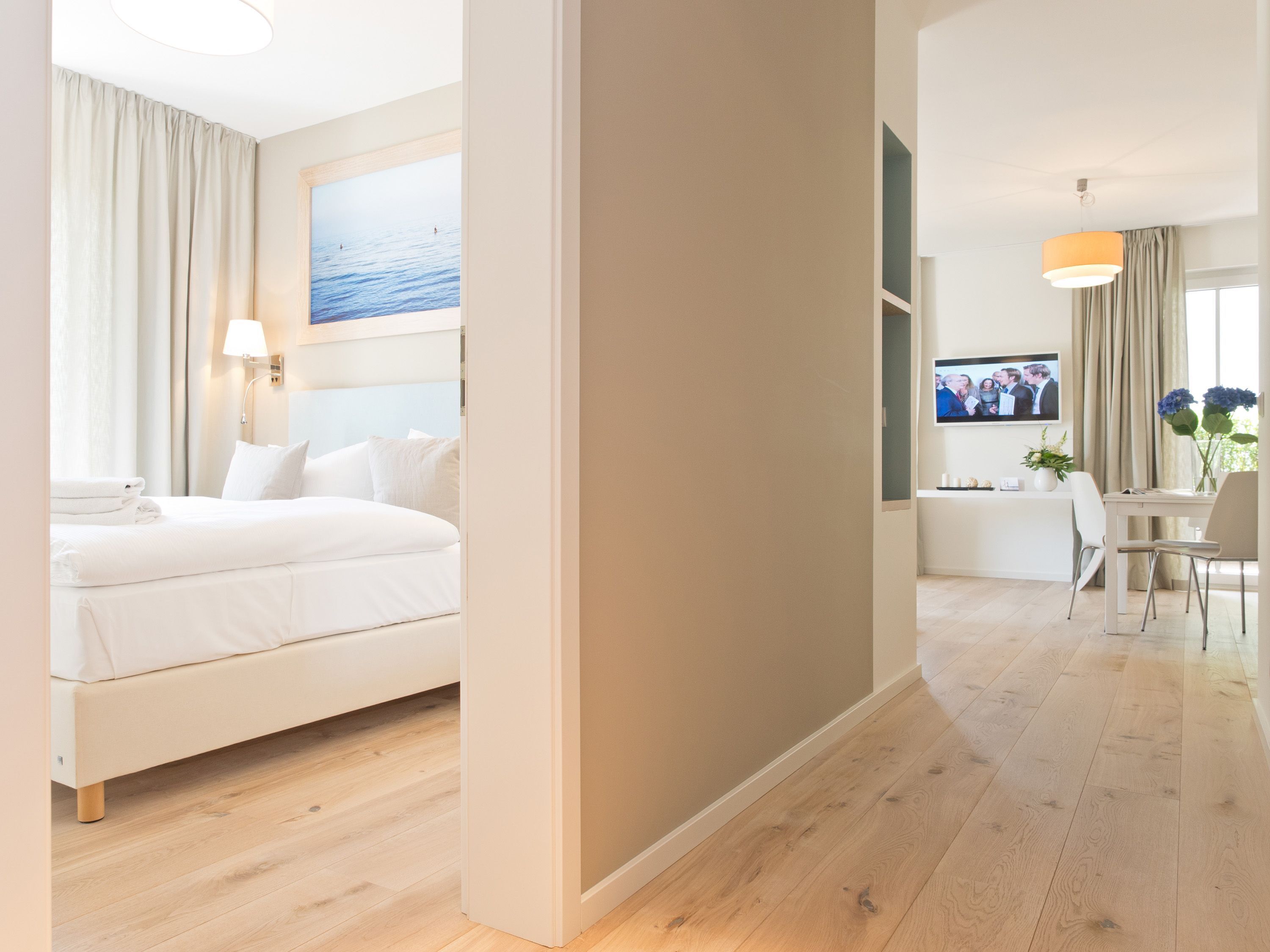 Modern und stylisch gestaltet - Willkommen in der Ferienwohnung 19 - im Südhaus des Dünenpalais. Das großzügige 2-Raum-Appartement (60 qm) für 2 Personen und ein Kleinkind (bis 3 Jahre im Kinderreisebett) wurde von einer Innenarchitektin designt und überzeugt nicht nur mit geschmackvoller Ausstattung, sondern auch zwei besonderen Highlights. Die wohnungseigene kleine Sauna ist gegen eine Gebühr von 2,00 EUR / Stunde zu nutzen. Und der per Fernbedienung zu bedienende Gaskamin sorgt nicht nur in der Winterzeit für gemütliche Stunden auf der Couch. Der Wohnbereich mit Sitzgruppe und offener Küche mit großem Esstisch, wird ergänzt durch ein großzügiges Schlafzimmer mit Doppelbett (und zusätzlichem TV) und ein modernes Bad mit Dusche und WC. Auf 2 schönen Balkonen mit Gartenmöbeln (1x Südseite/ 1x Westseite) genießen Sie bis in die Abendstunden hinein die Usedomer Sonne. 1 PKW-Stellplatz steht vor dem Haus zur Verfügung. Für Ihren Komfort sind die Betten bei der Anreise bezogen und ein Handtuchpaket liegt bereit. Auf Wunsch stellen wir ein Kinderreisebett (ohne Matratze [&] Bettzeug) und einen Kinderhochstuhl gegen einen Aufpreis zur Verfügung.