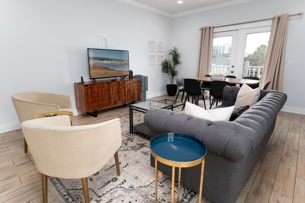 Das Wohnzimmer ist mit einem RokuTV ausgestattet, sodass Sie auf Apps wie Netflix, Pandora, Amazon Prime Video und Sling zugreifen können. Wir haben auch mehrere Spiele für Kinder und Erwachsene + Zeitschriften für den Fall eines regnerischen Tages.