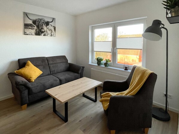 • Wohnzimmer mit Sofa, Sessel, Tisch und Smart-TV