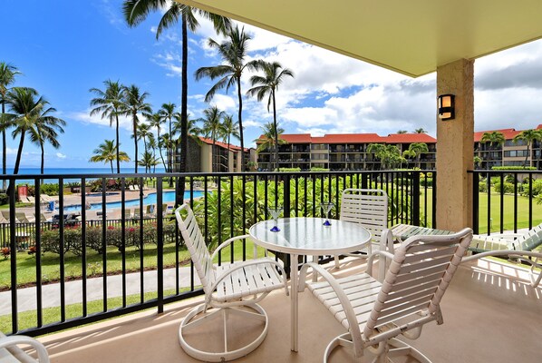 Günstig im zweiten Stock des K-Gebäudes gelegen, mit fantastischem Panoramablick auf das Meer, die Koi-Teiche, das Putting Green, die üppigen Gärten und den Pool am North Ka'anapali Beach! Tiki-Fackeln erleuchten jeden Abend die üppigen Gärten. Aktualisiert, Sommer 2011, einschließlich iPod-Dockingstation, dekorativer Bettwäsche und Accessoires sowie aktualisiertem Küchenbedarf und Geräten. Die 2 Schlafzimmer und 2 Badezimmer befinden sich alle auf einer Etage. Wachen Sie mit den Klängen und Sehenswürdigkeiten des Ozeans auf. Deckenventilatoren und eine Fensterklimaanlage im Wohnzimmer halten die Wohnung kühl. Bringen Sie Ihre elektronischen Geräte mit und genießen Sie kostenlosen WLAN-Internetzugang in unserer Wohnung. Condo verfügt über eine Waschmaschine und Trockner in voller Größe und einen Safe für Ihren Reisepass und Wertsachen. Full-Service-Rezeption Privilegien gelten für alle Anmietungen in dieser Wohnung.