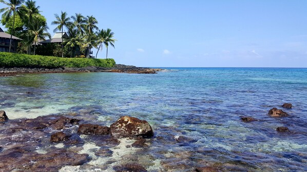 Umgebung: Direkt gegenüber von Magic Sands Beach. Nur wenige Minuten vom großen Schnorcheln am Kahalu'u Bay entfernt! Geschützte, klare Bucht und viele Meeresschildkröten. KTA Lebensmittelgeschäft, Longs drogerie, L & L Hawaiian BBQ. Kona's bestes Golfen!