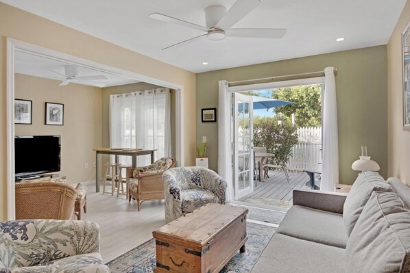 Diese 1BR 1BA Wohnung hat ein extra großes Wohnzimmer mit einem großen Fernseher. Es sitzt eingebettet in der Rückseite der Werft, die bis zum Eingang zum Ft Zachary Taylor State Park, der den schönsten Strand in Key West hat. Außengrill