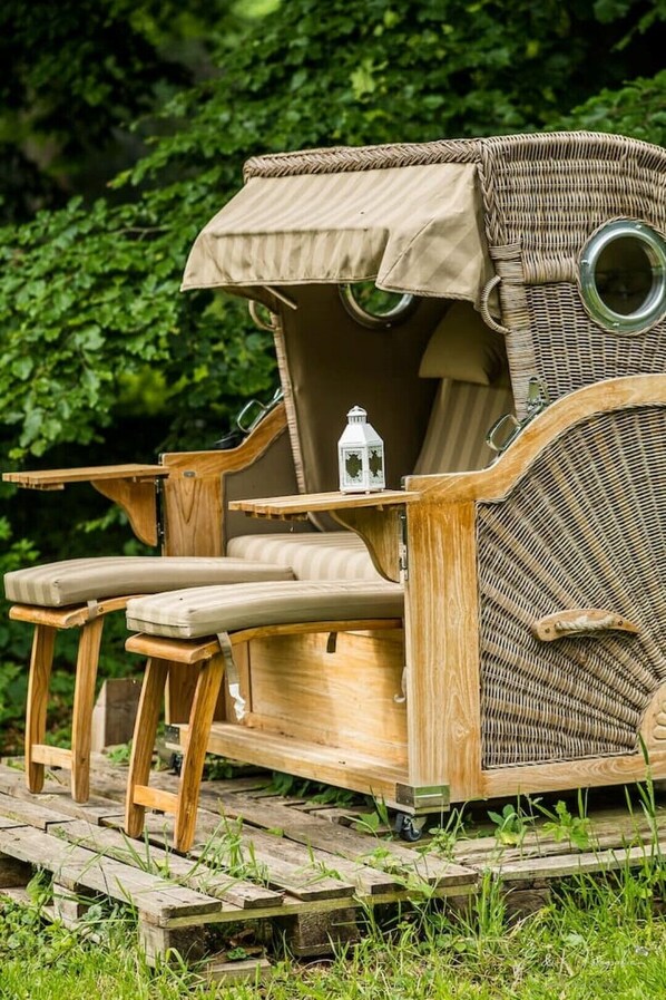 Es gibt eine Feuerstelle im Park, einen gemütlichen Strandkorb.