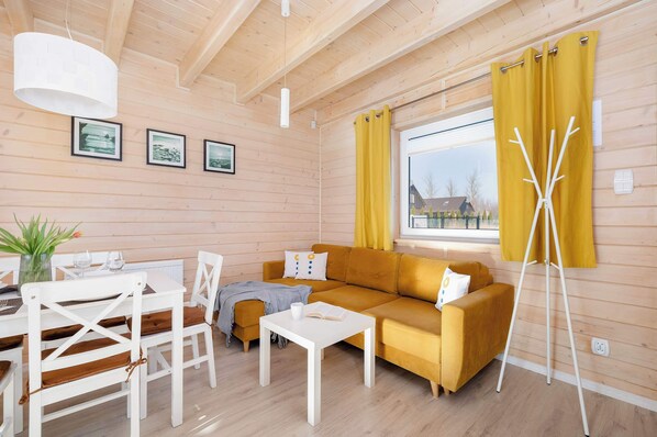 Das Angebot umfasst ein Holzferienhaus von ca. 52m2, das bequem Platz für 5 Personen bietet. Das Ferienhaus befindet sich in einer malerischen Lage, umgeben von viel Grün und Platz zum Entspannen. Im Außenbereich gibt es eine gepflegte Einfahrt sowie einen Kinderspielplatz mit Holzkonstruktionen, Schaukeln und einem Trampolin, was es zu einem idealen Ort für Familien mit Kindern macht. Außerdem können die Gäste den gemeinschaftlichen Schuppen mit Grillplatz nutzen. Es handelt sich um ein zweistöckiges Holzhaus mit einer hellen Fassade und großen Balkonen. Die Innenräume sind geräumig und in hellen Farben gehalten, wobei Naturholz dominiert, was eine warme und gemütliche Atmosphäre schafft. Die Aufteilung der Räume umfasst ein Wohnzimmer mit Kochnische, zwei Schlafzimmer, ein Badezimmer mit Dusche, ein separates WC, einen Balkon und eine Terrasse. Das geräumige Wohnzimmer ist im skandinavischen Stil eingerichtet und verfügt über große Fenster, die viel Tageslicht hereinlassen. Das Wohnzimmer verfügt über ein bequemes gelbes Sofa mit Schlaffunktion, einen Couchtisch, einen Fernseher und einen Esstisch mit Stühlen für mehrere Personen. Außerdem sorgen dekorative Kissen und gelbe Vorhänge für ein warmes Ambiente. In der modernen und gut ausgestatteten Küchenzeile mit weißen Möbeln und hochwertigen Geräten können Sie bequem Mahlzeiten zubereiten. Über eine Holztreppe gelangt man in den ersten Stock, wo sich zwei Schlafzimmer und eine separate Toilette befinden. Eines der Schlafzimmer hat ein Doppelbett und ein Einzelbett, das andere hat zwei Einzelbetten und einen Ausgang zum Balkon. Im Erdgeschoss gibt es ein Badezimmer mit Dusche, das mit einem Haartrockner und einer Waschmaschine ausgestattet ist, um Ihren Aufenthalt noch angenehmer zu gestalten. Für die Abendunterhaltung sorgen Multimedia-Geräte wie ein Flachbild-Satellitenfernseher und kostenloser Wi-Fi-Zugang. Zu Beginn des Aufenthalts werden den Gästen kostenlose Toilettenartikel, Handtücher und Bettwäsche zur Verfügung gestellt. Sie können mit Ihrem Haustier in die Wohnung kommen. Darüber hinaus gibt es einen ausgewiesenen Parkplatz vor jedem Haus.