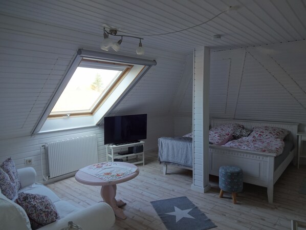 Die Unterkunft verfügt über eine kleine Diele, von der aus links eine Tür in die vollausgestattete Küche mit Essbereich führt. Sie verfügt über: Kühlschrank mit Gefrierfach - Mikrowelle - Ceran Kochfeld mit Backofen - Kaffeemaschine - Toaster - Mixer - Eierkocher Durch eine Zwischentür gelangt man in den Wohn-Schlaf-Raum mit gemütlicher Sitze-Ecke, Fernsehen (mit Blue-Ray-Player), Stereoanlage, Kleiderschrank. Kommode und der Schlafgelegenheit (Doppelbett: Matratzen 2 x 90 cm). Das W-LAN mit Gastzugang (Surfen und E-Mail) steht Ihnen kostenfrei zur Verfügung. Von dort führt eine Tür in das Tageslicht-Bad mit Dusche. Ein Spiegel, ein Waschtisch sowie ein Hängeschrank für die Unterbringung Ihrer persönlichen Dinge runden das Wohlgefühl im Badezimmer ab.