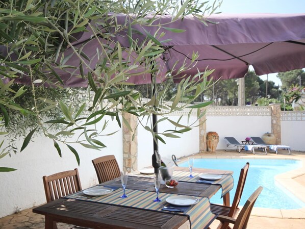 In einer schönen Umgebung zwischen Strand und Pinienwald finden Sie dieses gemütliche Haus mit möblierter Terrasse, auf der Sie essen, etwas trinken oder sich einfach auf einem Liegestuhl am Rand des privaten Poolsentspannen können. Es ist ebenerdig aufgeteilt in ein gemütliches Wohn- und Esszimmer mit Fernseher, WLAN und Klimaanlage, eine ausgestattete Küche, ein Badezimmer und zwei Schlafzimmer.
