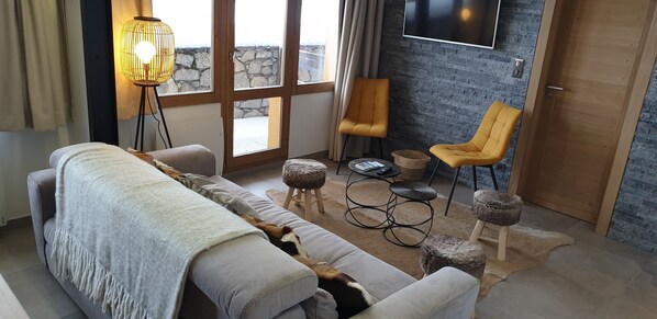 La déco est faite avec des matériaux de qualités, alliance de pierre et de bois pour un style moderne et montagnard...