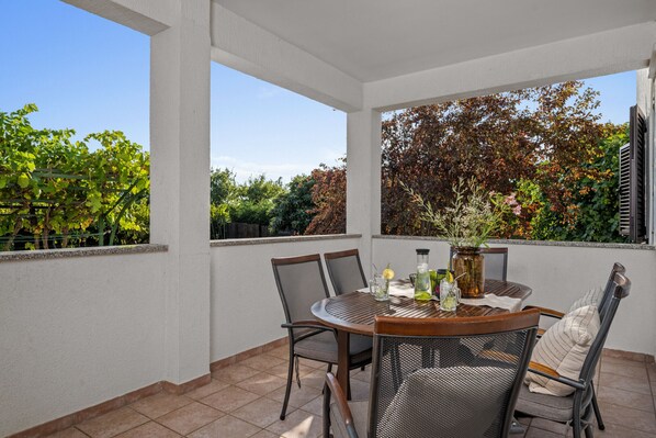 Genießen Sie entspannte Stunden auf unserer wunderschönen überdachten Terrasse, während Sie den malerischen Blick auf unseren grünen Außenbereich und den großen einladenden Pool genießen. Die Außengrillstelle mit einem gemütlichen Esstisch ist perfekt für gesellige Abende im Freien.
