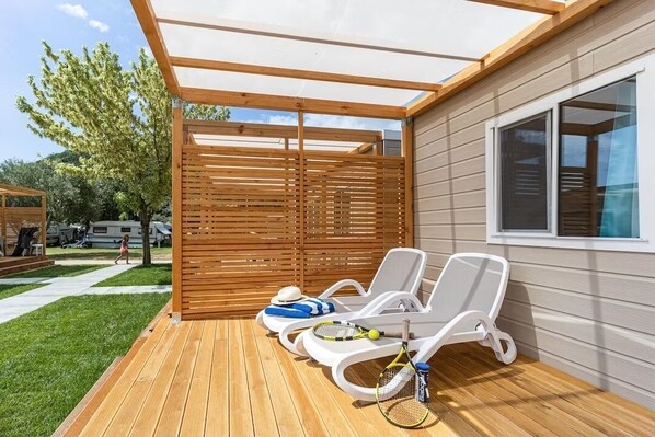 Die Unterkunft Premium bietet Platz für max. 4 Personenund besteht aus einem Elternschlafzimmer mit Doppelbett, sowie einem Kinderzimmer mit zwei Einzelbetten. Im Wohnzimmer gibt es einen SAT-TV. Die gut eingerichtete Küche befindet sich im Wohnbereich und verfügt über Geschirr, Besteck und Pfannen, eine Filterkaffeemaschine,sowie Kühlschrank mit Eisfach. Die beiden Badezimmer verfügen je über eine Dusche sowie Waschbecken und WC. Der gedeckte Sitzplatz, mit Tisch und Stühlen sowie zwei Liegen, lädt zum gemütlichen Entspannen ein, während die Kinder sich auf dem Spielplatz oder am Pool austoben können. Fahrzeit ab ital. Grenze ca. 6.5h. Hinweis Wenn Sie mehr als eine Unterkunft benötigen, ist dies bei uns in der Regel möglich, da wir über mehrere Objekte des gleichen Haustyps verfügen.