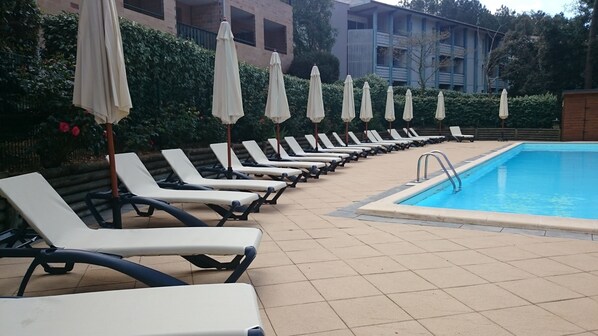 In der Stadt Lacanau Océan in einer renommierten Wohnanlage, mit Hotelrestaurant Spa 4 Sterne, mit privatem beheiztem Pool, Reihenhaus mit Dekoration und Ruhe unter den Pinien: bestehend aus 3 Hauptzimmern mit bis zu 7 Betten: Hauptschlafzimmer mit Kingsize-Bett 180 cm, 1 Zimmer mit 3 Betten 90 cm, darunter 2 Etagenbetten, ein Schlafsofa im Wohnzimmer 140 cm und ein Kinderbett.