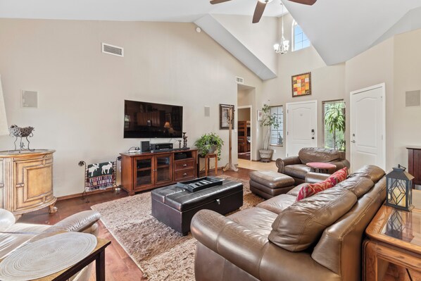 Genießen Sie unser modernes, offenes Konzept mit 3 Schlafzimmern und 2 Bädern in einer gehobenen Wohnanlage in Pinetop-Lakeside. Dies ist eine Gemeinde am See mit privatem Zugang zum Rainbow Lake (ca. 5 Gehminuten). Die Küche verfügt über neuere Geräte, einen Gasherd und Granit-Arbeitsplatten. Das Familienzimmer verfügt über Holzböden, Ledermöbel, einen 60-Zoll-Flachbildschirm mit Surround-Sound und die Samsung Blue Tooth Music Soundbar. Master bdrm verfügt über einen 50-Zoll-Flachbildschirm und ein bequemes Queensize-Bett. Master-Bad ist riesig mit begehbarer Dusche und beheiztem Handtuchhalter. In der Garage können Sie Ausrüstung und Spielzeug sichern. In der Garage können Sie Spielzeug nutzen (Kajak, Kanu, Fahrräder usw.). Geräumiger Garten mit Erdgasgrill und Veranda für zusätzliche Entspannung.